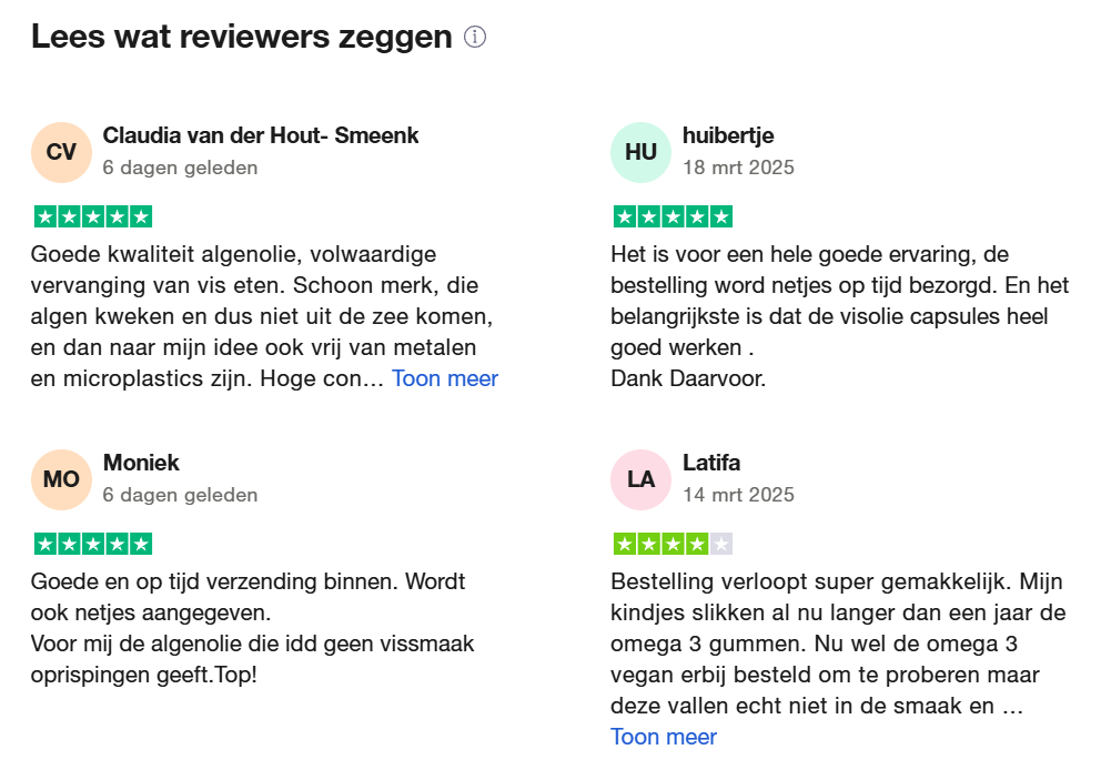 De Gezondheidsraad adviseert volwassenen om dagelijks 200 milligram omega-3-vetzuren uit vis te consumeren. Met één portie vis per week voldoe je aan deze aanbeveling. Als dat niet lukt, zijn visoliecapsules of algenolie goede alternatieven, rijk aan EPA en DHA. Algenolie wordt rechtstreeks uit algen gewonnen, en er zijn duurzame opties waarbij omega-3 uit visfilets afkomstig is, zonder extra vissen te vangen.