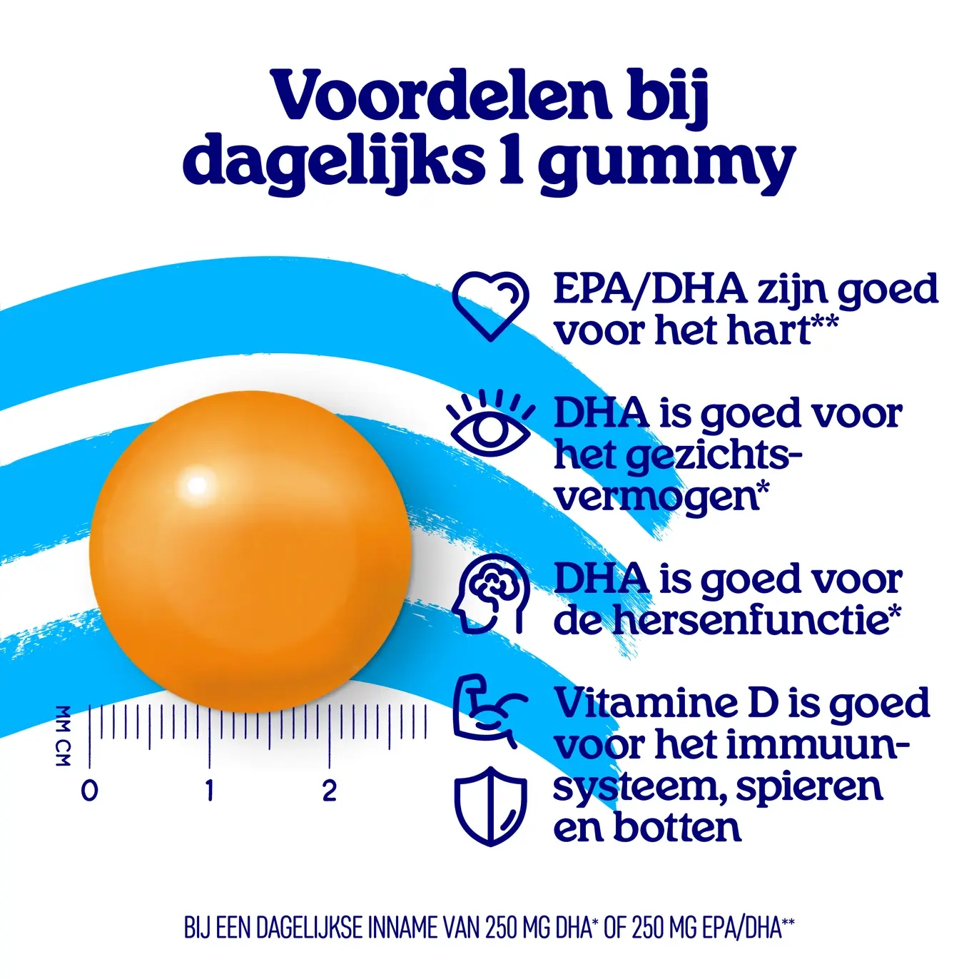 DHA bevordert een normale hersenfunctie en gezichtsvermogen, terwijl 3 gram EPA en DHA helpt om een normale bloeddruk te behouden.