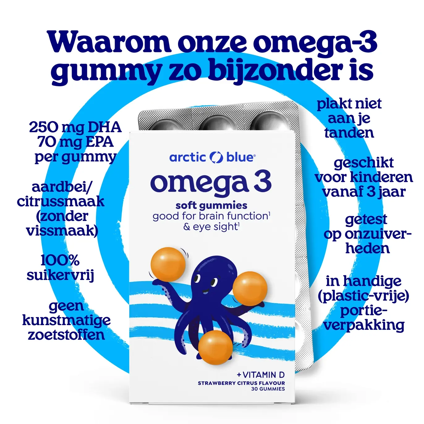 Met DHA en EPA Omega-3 vetten, plus Vitamine D3, ondersteunen onze producten de hersenfunctie, ogen, hart, botten, spierfunctie en het immuunsysteem. Gummies zijn populair vanwege hun smaak, maar ze hebben ook nadelen. Ze bevatten vaak suiker en veel calorieën, plakken aan je tanden en de binnenkant van de pot. Bovendien bevatten de Omega-3 varianten vaak verrassend weinig Omega-3, wat erg teleurstellend is.